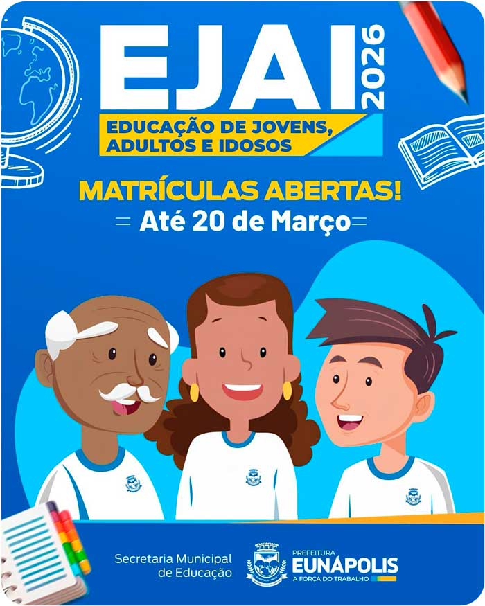 A Prefeitura de Eunápolis, por meio da Secretaria Municipal de Educação, está com inscrições abertas até o dia 20 de março de 2026 para a Educação de Jovens, Adultos e Idosos (EJAI). A modalidade é destinada a pessoas que não tiveram acesso ou não concluíram os estudos na idade adequada, garantindo o direito à educação e oferecendo novas oportunidades de aprendizado, inclusão escolar e desenvolvimento pessoal.