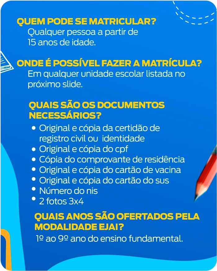 No município, a EJAI é ofertada do 1º ao 9º ano do Ensino Fundamental, permitindo que jovens, adultos e idosos retomem seus estudos e avancem em sua formação educacional. As matrículas devem ser realizadas diretamente na escola da rede municipal mais próxima da residência do estudante.