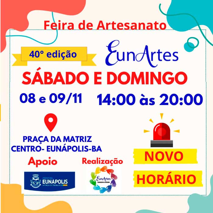 A Feira de Artesanato EunArtes chega à sua 40ª edição, celebrando o talento e a originalidade dos artesãos de Eunápolis e região. O evento será realizado na Praça da Catedral, no centro da cidade, em novo horário — das 14h às 20h, reunindo arte, cultura, gastronomia e lazer para toda a família.