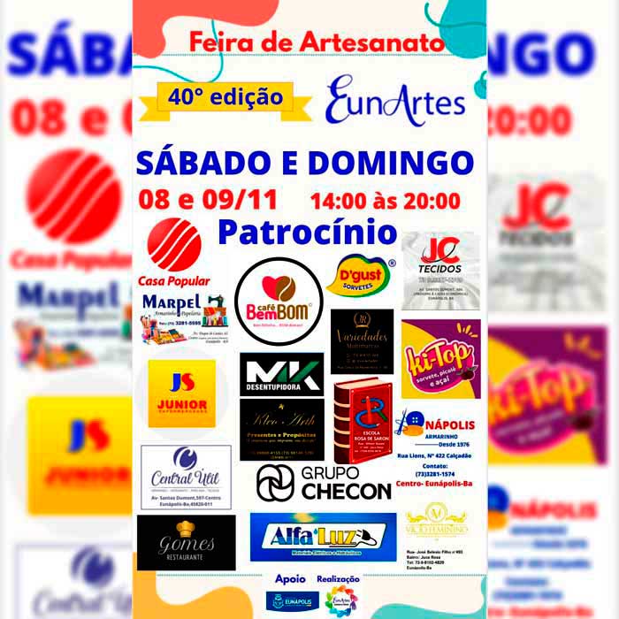 Com apoio institucional da Prefeitura de Eunápolis e apoio cultural do site NossaCara.com, a 40ª edição da EunArtes reafirma seu papel como um dos eventos mais importantes da cidade, fortalecendo a economia criativa e valorizando o trabalho dos artesãos locais.