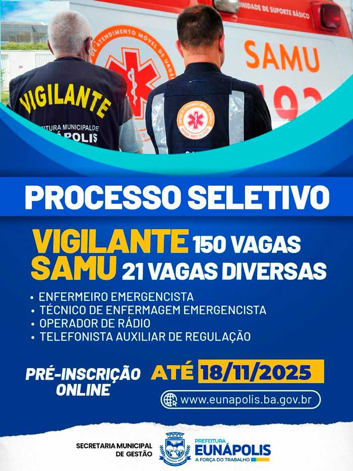 A Prefeitura de Eunápolis anunciou a abertura de dois Processos Seletivos Simplificados com o objetivo de contratar profissionais temporários para atender diferentes áreas do serviço público. O Processo Seletivo Edital 006/2025 oferece 150 vagas para Vigilantes, enquanto o Processo Seletivo Edital 007/2025 destina 21 vagas para o SAMU 192, com cargos de enfermeiro, técnico de enfermagem, operador de rádio e telefonista auxiliar de regulação. Ambos os processos seletivos são regidos pelo Regime Especial de Direito Administrativo (REDA) e têm jornada de trabalho de 40 horas semanais.