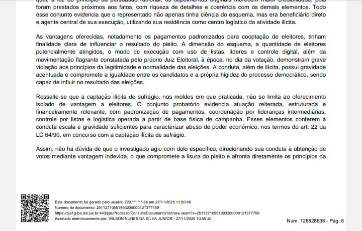 As provas contra o vereador são robustas. Ele foi enquadrado no Artigo 41 A da Lei Eleitoral, tendo anulados todos os votos recebidos, ficando ainda inelegível por 8 anos, de acordo com a sentença.