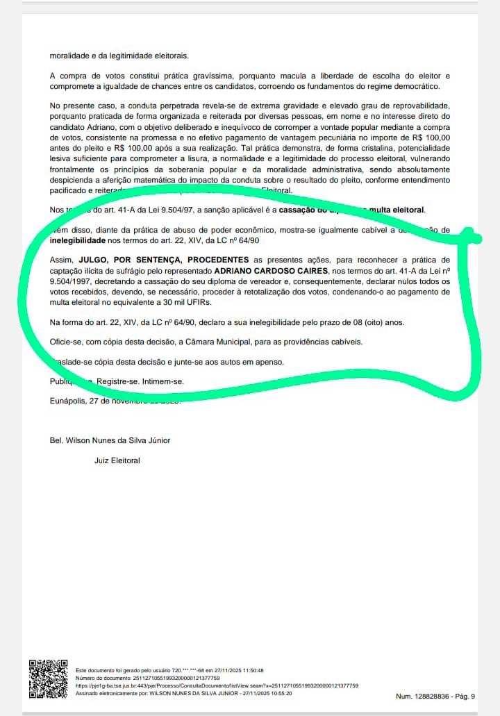 O vereador Adriano Cardoso (PP), o mais votado de Eunápolis, teve o diploma cassado pelo juiz eleitoral da cidade, Wilson Nunes, por compra de votos, em ação movida pelo Ministério Público Eleitoral. Com diploma cassado Adriano perde o mandato.