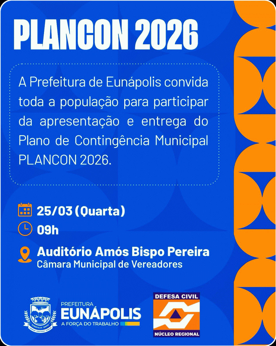 A Prefeitura de Eunápolis realiza, nesta quarta-feira (25), às 9h, a apresentação e entrega do Plano de Contingência Municipal – PLANCON 2026, no Auditório Amós Bispo Pereira, localizado no térreo da Câmara Municipal de Vereadores. O documento organiza as ações do município diante de possíveis emergências, com foco na atuação coordenada e eficiente dos órgãos envolvidos.