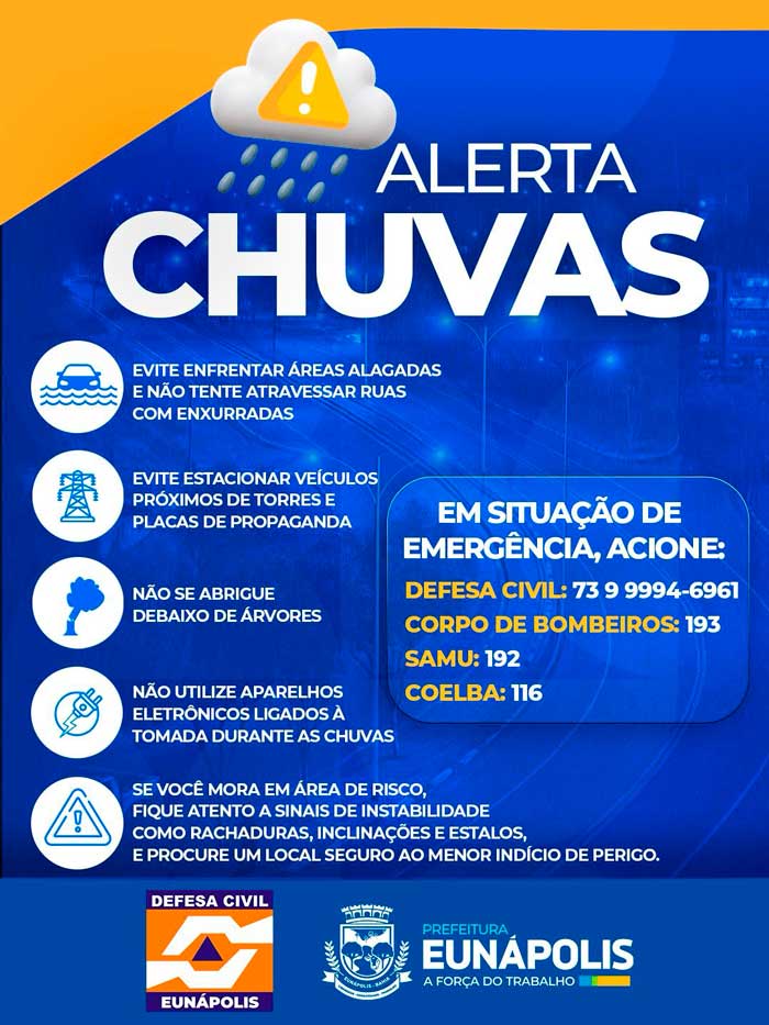 A Defesa Civil de Eunápolis emitiu, nesta quarta-feira (26), um alerta para a possibilidade de chuvas intensas nas próximas horas. O aviso, publicado pelo Instituto Nacional de Meteorologia (INMET), tem início às 9h40 de 26/11/2025 e prevê precipitações entre 30 e 60 mm/h, podendo chegar a 50 a 100 mm em um dia, além de ventos fortes entre 60 e 100 km/h.