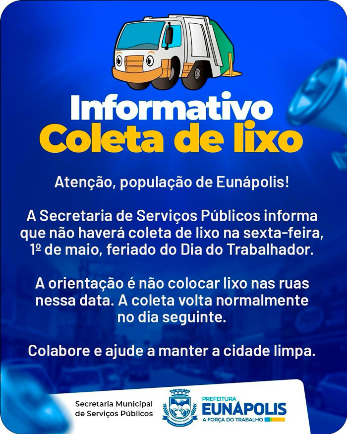 A Prefeitura de Eunápolis, por meio da Secretaria Municipal de Serviços Públicos, informa que não haverá coleta de lixo na sexta-feira, 1º de maio, em razão do feriado do Dia do Trabalhador. A orientação é que a população não coloque resíduos nas ruas nesta data, contribuindo para a limpeza e organização da cidade. O serviço será retomado normalmente no sábado (2).