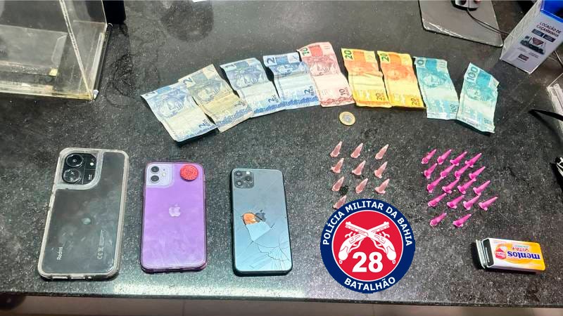 Diante da atitude suspeita, foi realizada a abordagem e busca pessoal, sendo encontrados na bolsa de duas das mulheres, menores de idade, 29 pinos contendo substância análoga a cocaína e a quantia de 280 reais.