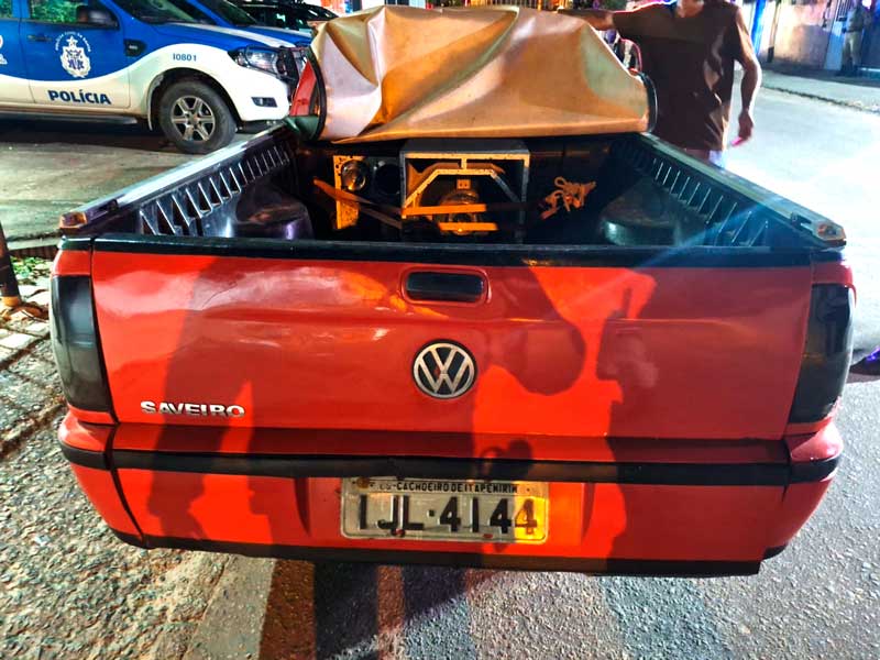 A mulher foi conduzida e apresentada à Delegacia de Polícia, onde também foi apresentado o veículo VW/Saveiro 1.6, cor vermelha, placa IJL-4144, juntamente com o som automotivo utilizado na prática da perturbação do sossego.