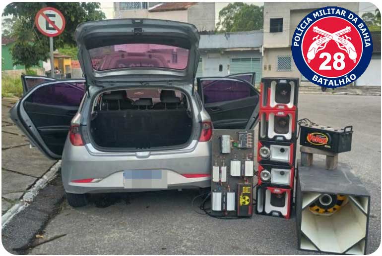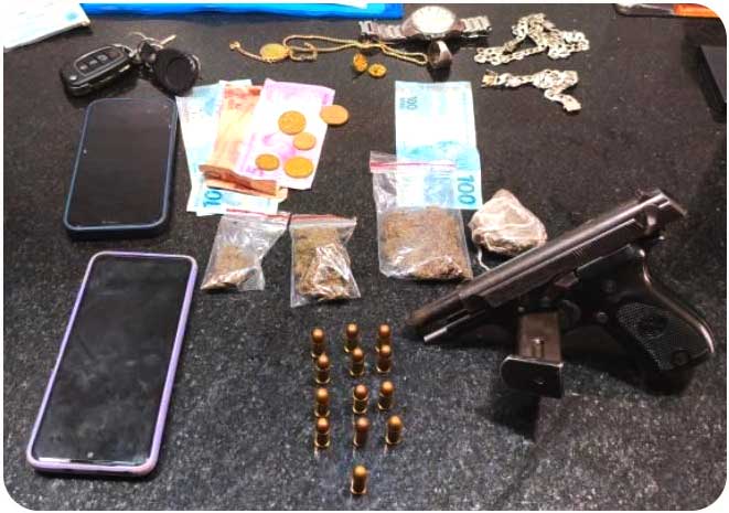 Durante a abordagem, foi encontrada uma pistola calibre .380, com 13 munições, além de 47 gramas de maconha, mais de R$ 300,00 em espécie e dois aparelhos celulares. Também foram apreendidos equipamentos sonoros irregulares, incluindo alto-falantes, módulos, cornetas, tweeters, processador de áudio e fonte automotiva.