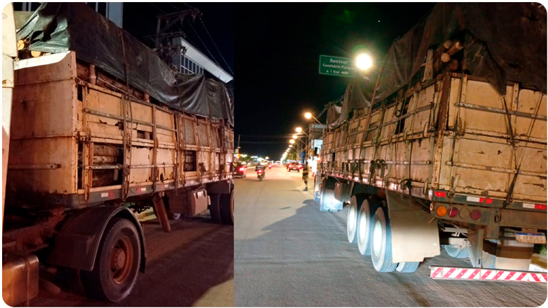 Durante a abordagem, representantes da empresa de segurança patrimonial compareceram ao local e relataram que vinham monitorando o veículo, apontando que a carga — aproximadamente 60m³ de eucalipto — seria proveniente de furto.