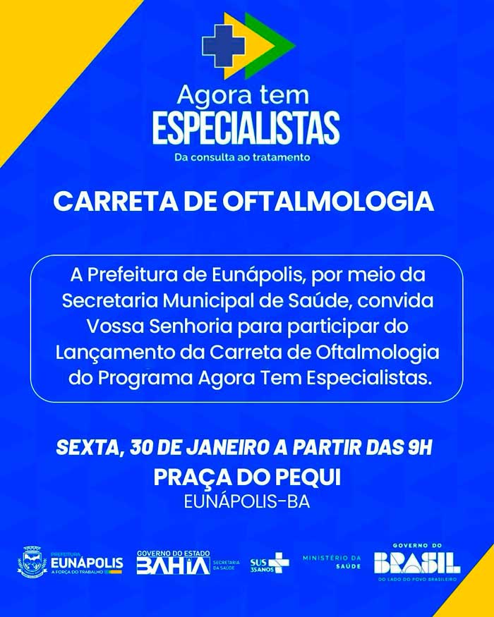 Convidamos toda a imprensa para cobrir e prestigiar o lançamento da Carreta de Oftalmologia do Programa Agora tem Especialistas em Eunápolis.