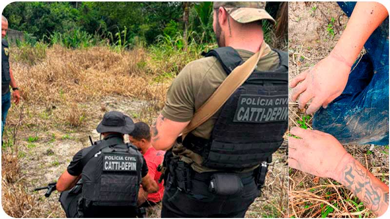 Poucos minutos depois, em diligências contínuas, equipes da Polícia Militar realizaram cerco na região, logrando êxito em localizar um indivíduo que estava sujo de barro e demonstrou intenso nervosismo ao ver os policiais. O suspeito foi reconhecido pela vítima como um dos autores do sequestro, sendo identificado como N. S. O, o qual foi flagranteado.