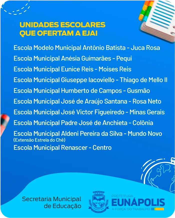 No município, a EJAI é ofertada do 1º ao 9º ano do Ensino Fundamental, permitindo que jovens, adultos e idosos retomem seus estudos e avancem em sua formação educacional. As matrículas devem ser realizadas diretamente na escola da rede municipal mais próxima da residência do estudante.