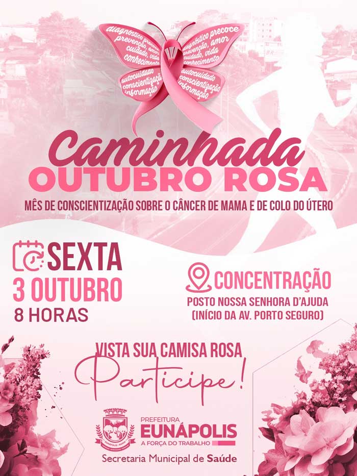 A Prefeitura de Eunápolis, por meio da Secretaria Municipal de Saúde, realiza na próxima sexta-feira (3) de outubro, a Caminhada do Outubro Rosa há, com o objetivo de conscientizar a população sobre a prevenção e o diagnóstico precoce do câncer de mama e do colo do útero. A concentração será na Avenida Porto Seguro, a partir das 8h, com chegada prevista na Praça da Bandeira, no centro da cidade.