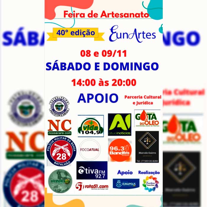 Com apoio institucional da Prefeitura de Eunápolis e apoio cultural do site NossaCara.com, a 40ª edição da EunArtes reafirma seu papel como um dos eventos mais importantes da cidade, fortalecendo a economia criativa e valorizando o trabalho dos artesãos locais.