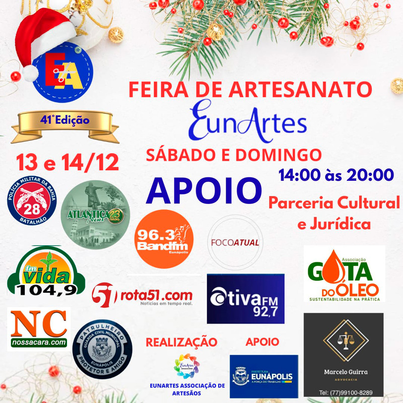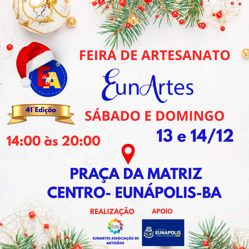 A tradicional Feira de Artesanato EunArtes chega à sua 41ª edição trazendo ainda mais encanto, variedade e experiências para toda a família. O evento será realizado nos dias 13 e 14 de dezembro, das 14h às 20h, na Praça da Catedral, no centro de Eunápolis — um espaço que se transforma em vitrine da arte local e ponto de encontro para quem valoriza criatividade, cultura e talento.