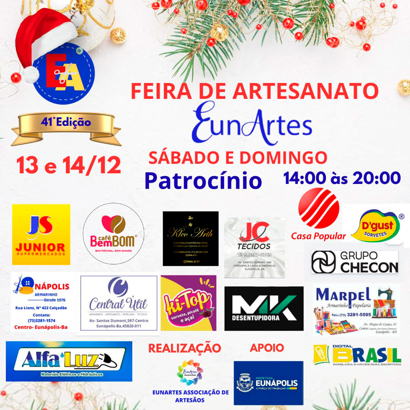 A Feira de Artesanato EunArtes deseja para todos um Feliz Natal e um Próspero Ano Novo, venha e traga a sua família.