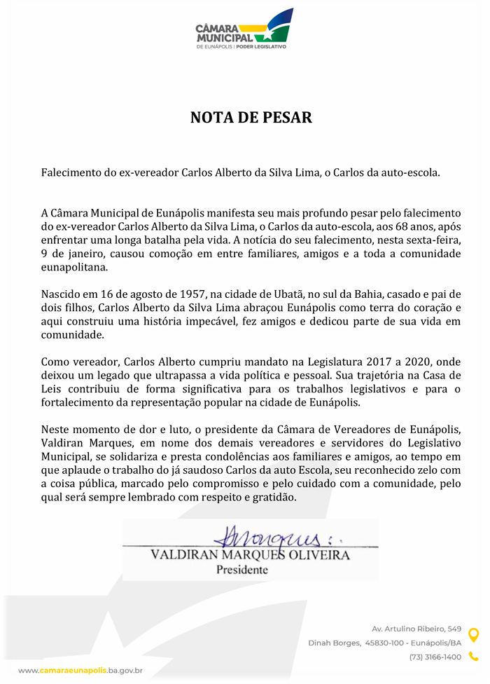 Câmara municipal de Eunápolis divulga NOTA de PESAR
