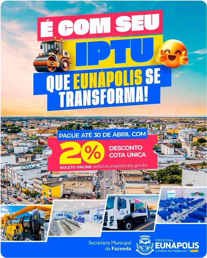 A Prefeitura de Eunápolis já disponibilizou, de forma online, os boletos do IPTU 2026, e este é o momento ideal para o contribuinte garantir economia e ainda colaborar diretamente com o desenvolvimento do município. Quem optar pelo pagamento em cota única até o dia 30 de abril assegura 20% de desconto, uma vantagem significativa para começar o ano com as contas em dia.