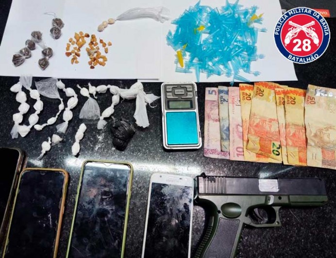 Durante a abordagem e busca pessoal, foram encontrados 90 trouxas de maconha, 32 trouxas de cocaína, 124 pedras de crack, 02 balanças de precisão, 04 aparelhos smartphone, 01 simulacro de pistola Glock, calibre .40 e centenas de embalagens eppendorfs.