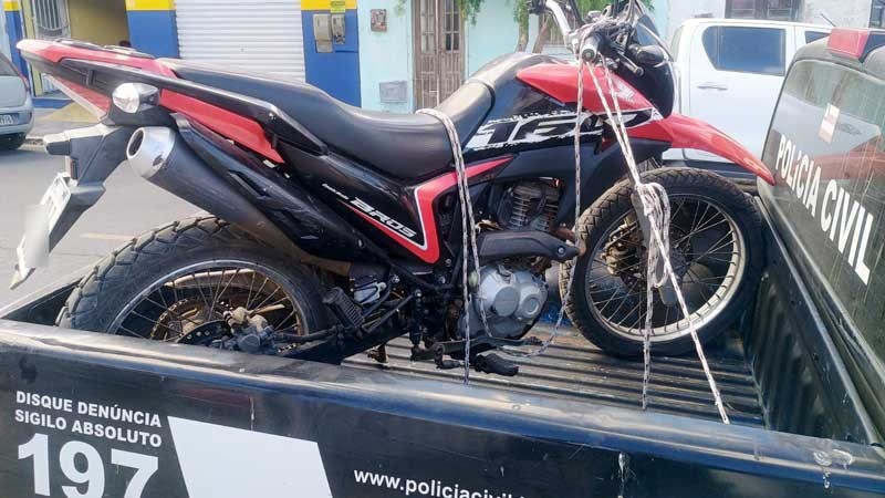 Uma motocicleta com suspeita de adulteração, um aparelho celular, três armas de fogo, entre elas uma espingarda calibre 12 e uma pistola semiautomática, munições, porções de cocaína, uma balança e três mil pinos utilizados para acondicionamento de entorpecentes.