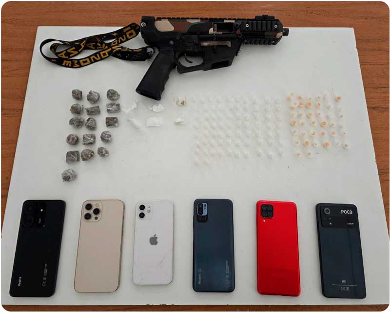 Foi revidada a injusta agressão na tentativa de salvaguardar a vida dos policiais. Cessado o confronto, durante varredura pelo local foi encontrada uma submetralhadora 9mm e uma sacola contento drogas. Desta forma, os itens foram apresentados à 1° DT.