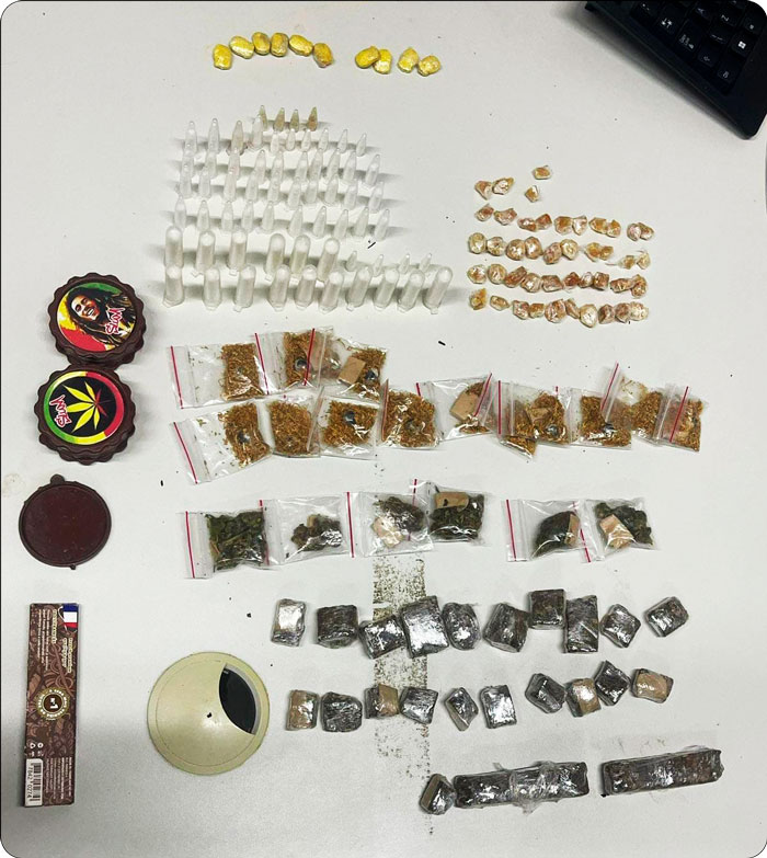 Após o acompanhamento e mediante verbalização e ordens legais, os suspeitos se renderam. Durante a abordagem, foram encontrados com os indivíduos 64 pinos de cocaína, 29 buchas de maconha, 13 buchas de haxixe, 44 pedras de crack, 10 comprimidos de MD, além de 02 dichavadores.
