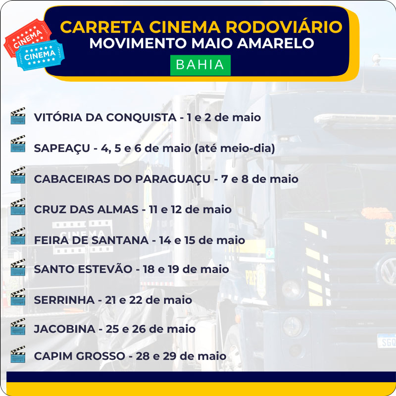 APolícia Rodoviária Federal (PRF) inicia, no dia 1º de maio, uma jornada educativa inédita por nove municípios baianos. Através da Carreta do Cinema Rodoviário, uma unidade móvel de última geração e única no país, a instituição levará cinema profissional e conscientização sobre segurança viária para estudantes e comunidades locais durante todo o mês de maio, em alusão ao movimento Maio Amarelo 2026.