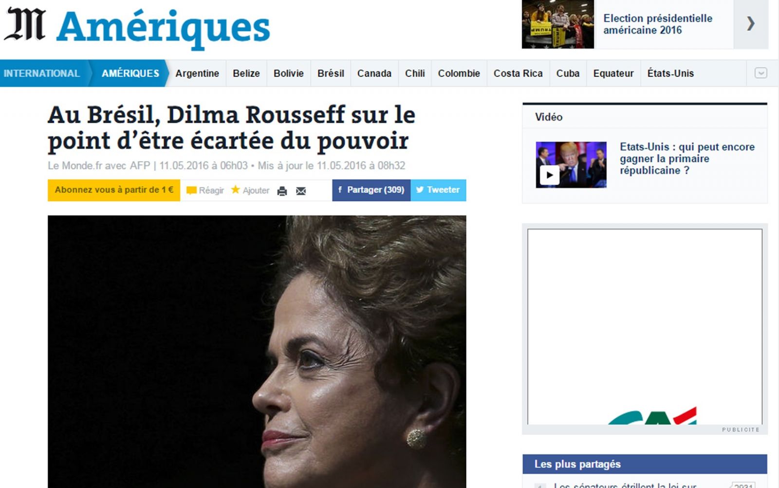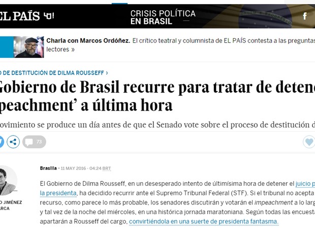 O francês Le Monde afirma que a chefe de estado brasileira pode estar vivendo “suas últimas horas no comando do país”. O jornal destaca que a “impopular dirigente de esquerda” não parece contar com a ajuda do Supremo Tribunal Federal para escapar do afastamento embora aliados tenham entrado com um recurso no último momento.