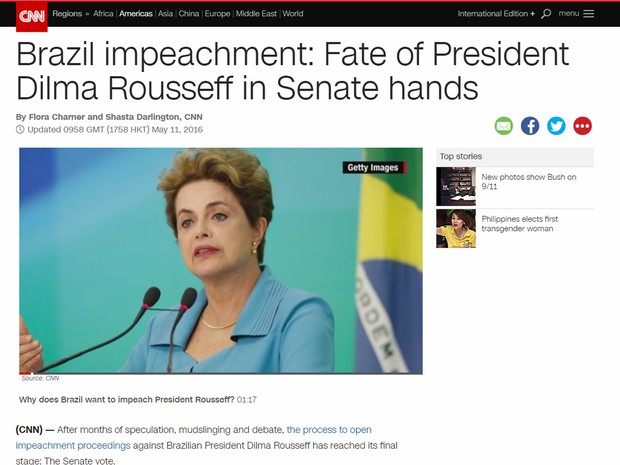 “Impeachement no Brasil: destino de Dilma Rousseff nas mãos do Senado”, diz a americana CNN. Após explicar que o processo que levará ao afastamento de até 180 dias chegou ao estágio final com votação no Senado prevista para esta quarta. A versão online destaca levantamento publicado pela imprensa brasileira que indica a tendência de aprovação do afastamento.