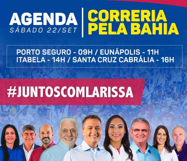 “Este é um momento muito importante para a Costa do Descobrimento, pois é a hora de mostrarmos ao governador que ele tem o nosso apoio. Sabemos que Rui Costa além de ser o melhor para a Bahia, é também hoje, segundo as pesquisas, o governador reeleito ainda no primeiro turno, por isso quanto mais prestigiado ele for por nossa região, mais força teremos para buscar junto à ele novas conquistas para nossas cidades. Por isso, conto com a presença maciça de toda população desses quatro municípios para que recepcionemos nosso governador como ele merece, com grande festa e alegria”, convidou Larissa Oliveira.