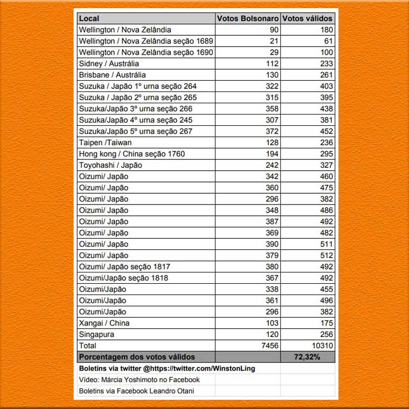 Nas 11 seções eleitorais de Oizumi, foram computados 5.698 votos e Bolsonaro conseguiu 3.980.