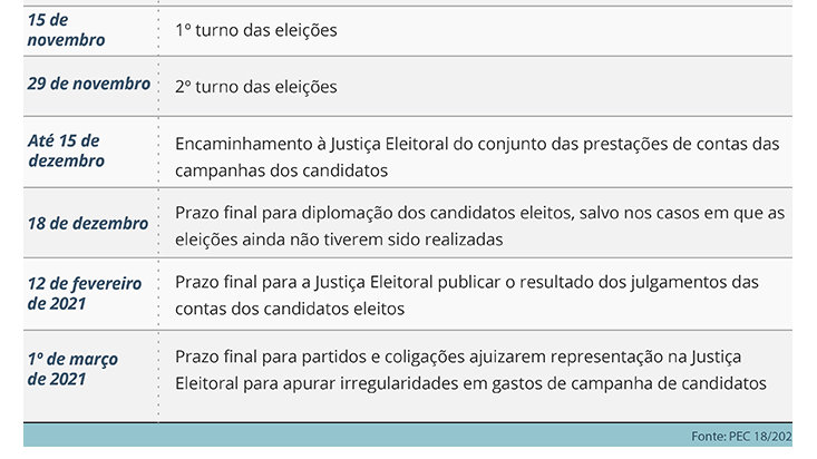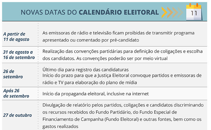 Além de adiar as eleições, a PEC, de autoria do senador Randolfe Rodrigues (Rede-AP), estabelece novas datas para outras etapas do processo eleitoral de 2020, como registro de candidaturas e início da propaganda eleitoral gratuita (veja quadro). Apenas a data da posse dos eleitos permanece a mesma, em 1º de janeiro de 2021.