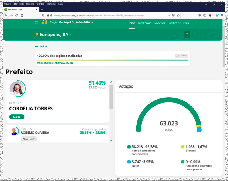 A candidata Cordélia Torres do DEM, foi eleita a prefeita de Eunápolis com 29.925 votos. O resultado foi definido na noite deste domingo (15/11).