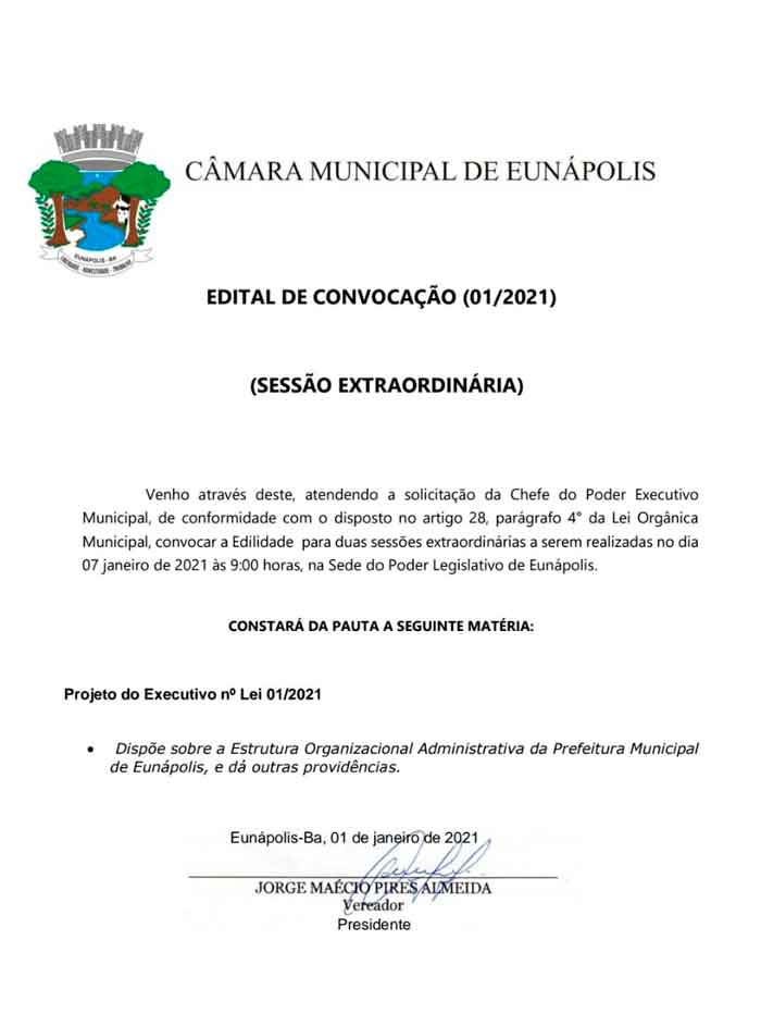 Atendendo a convocação da nova prefeita, Cordélia Torres (DEM), a Câmara de Vereadores de Eunápolis vai realizar duas sessões extraordinárias, nesta quinta-feira (07/01), às 9 h, para discutir e votar uma proposta de reforma administrativa onde a criação de cinco novas secretarias e a redução dos cargos em comissão é apresentada no escopo do Projeto de Lei número 01/2021.