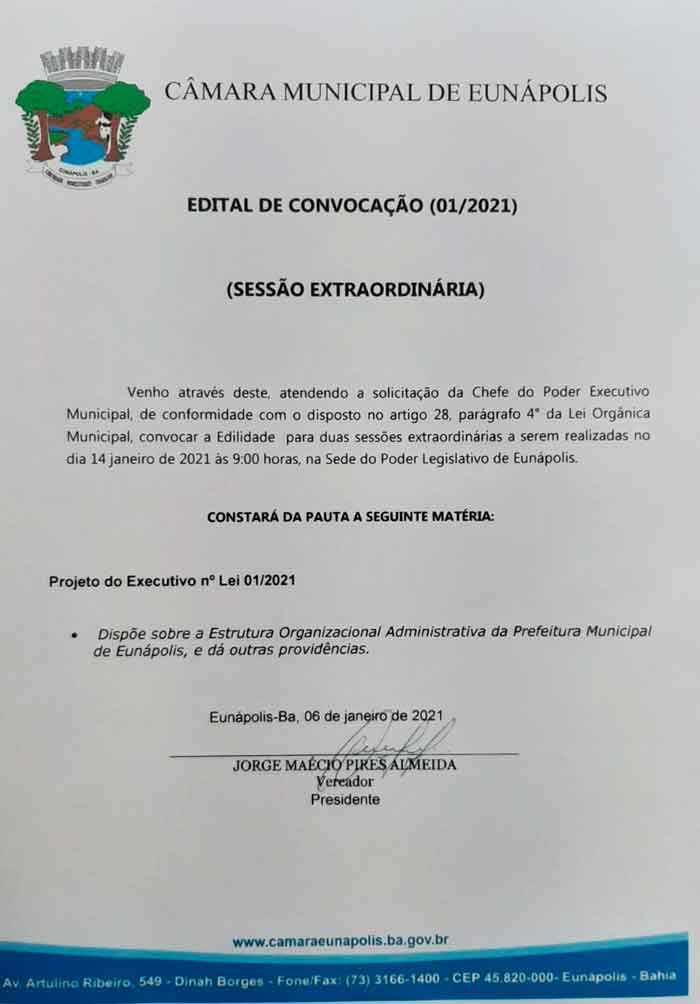 Um novo edital de convocação para as duas sessões extraordinárias foi divulgado pelo presidente da Mesa Diretora, Jorge Maécio (PP) em meio ao recesso parlamentar que vai até o dia 29 de janeiro de 2021, com primeira sessão ordinária do ano apenas no dia 04 de fevereiro, conforme portaria de número 01/2021.