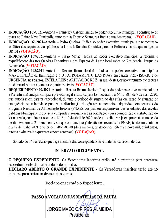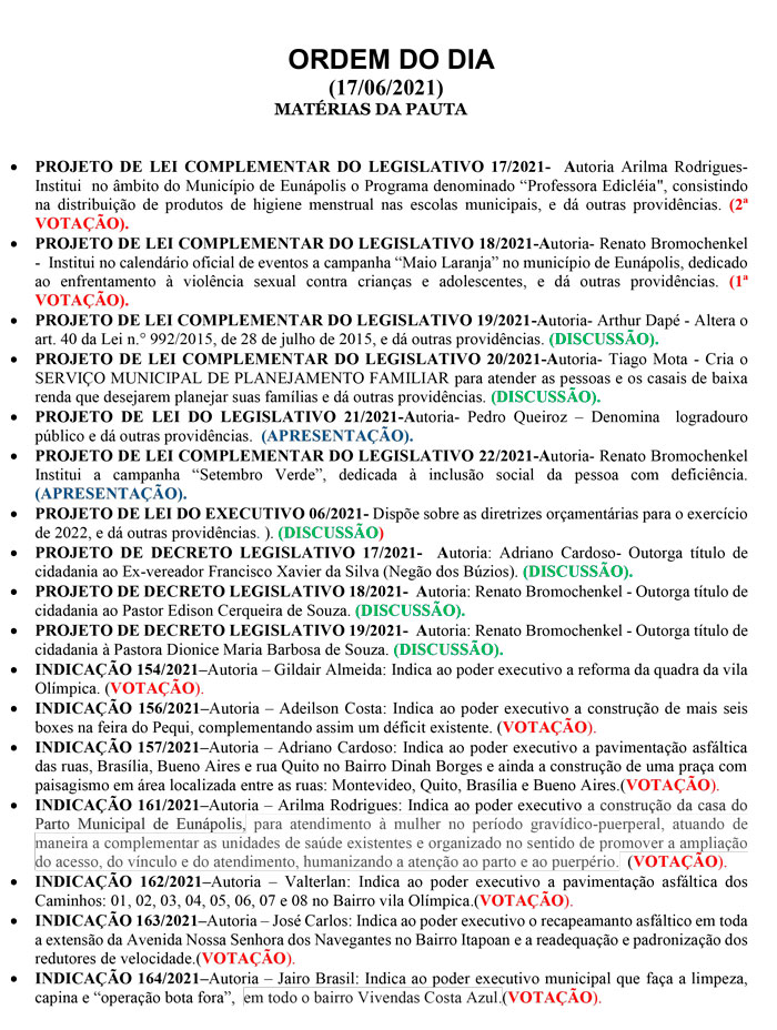 Câmara Municipal de Eunápolis divulga a ordem do dia de 17/06/2021