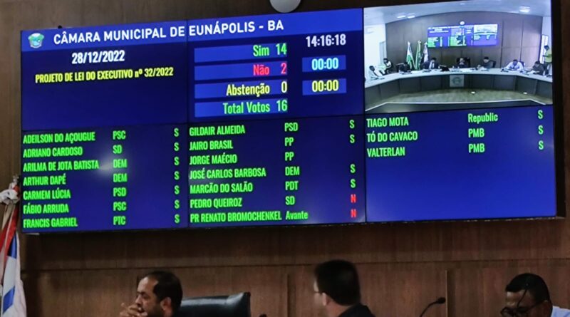 Pelo placar de 14×2 (o presidente da Casa não vota), os vereadores de Eunápolis aprovaram em duas sessões extraordinárias, nesta quarta-feira (28/12), o Projeto de Lei nº 32, que autoriza o Poder Executivo municipal a tomar empréstimo no valor de R$250 milhões junto à Caixa ou qualquer outro banco, para financiar obras de recuperação da infraestrutura da cidade, bastante afetada pelas chuvas que atingiram a cidade, incluindo a zona rural, desde o final do ano passado.