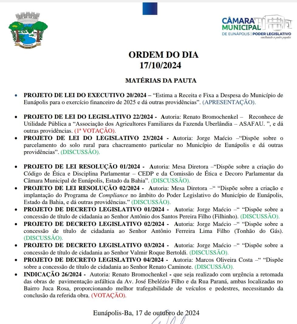 Na sessão ordinária da Câmara Municipal de Eunápolis, marcada para quinta-feira, 17 de outubro de 2024, serão discutidos diversos projetos do Executivo e Legislativo, incluindo projetos de resoluções, indicações e decretos legislativos.