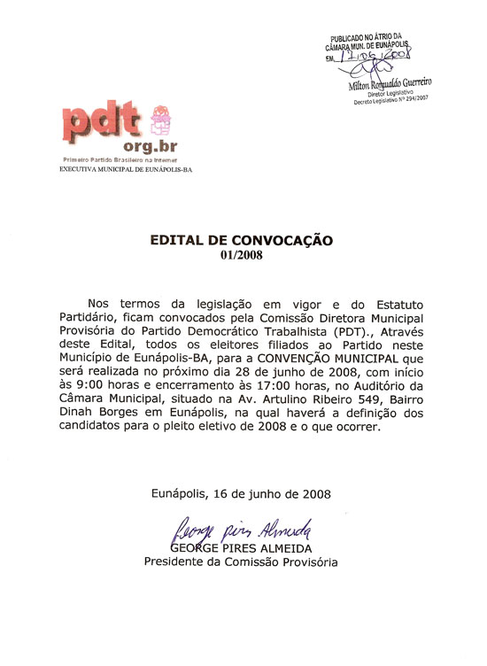 A direção do partido convida os filiados e simpatizantes a comparecerem à Convenção Municipal. A Câmara Municipal de Eunápolis está localizada na avenida Artulino Ribeiro, nº549, bairro Dinah Borges, na cidade de Eunápolis.