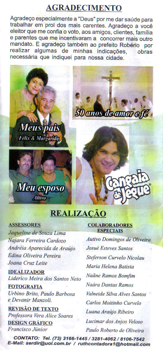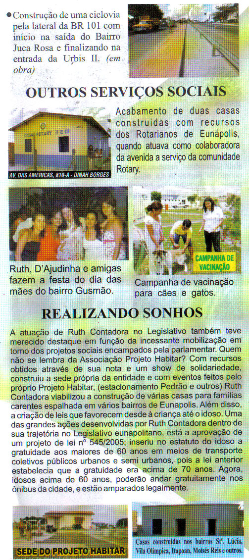 Reeleita para o seu segundo mandato no Legislativo de Eunápolis, a vereadora Félix Ruth Estêves Curvelo, Ruth Contadora (PTdoB), recebeu o resultado da eleição como uma demonstração do reconhecimento do trabalho por ela realizado nesse primeiro período na Câmara Municipal. E para reafirmar ao povo eunapolitano esse seu trabalho, a vereadora fez para a reportagem do nossacara.com um resumo do que de mais importante realizou.