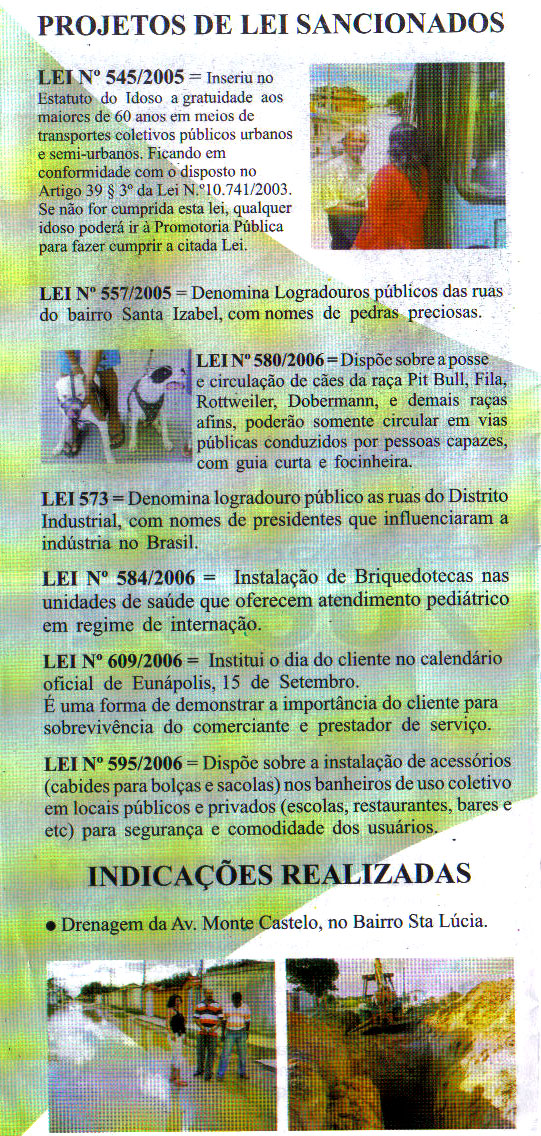Na Saúde, aprovou projeto que foi transformado em lei que determina a instalação de Brinquedotecas nas unidades de saúde que oferecem atendimento pediátrico em regime de internação.