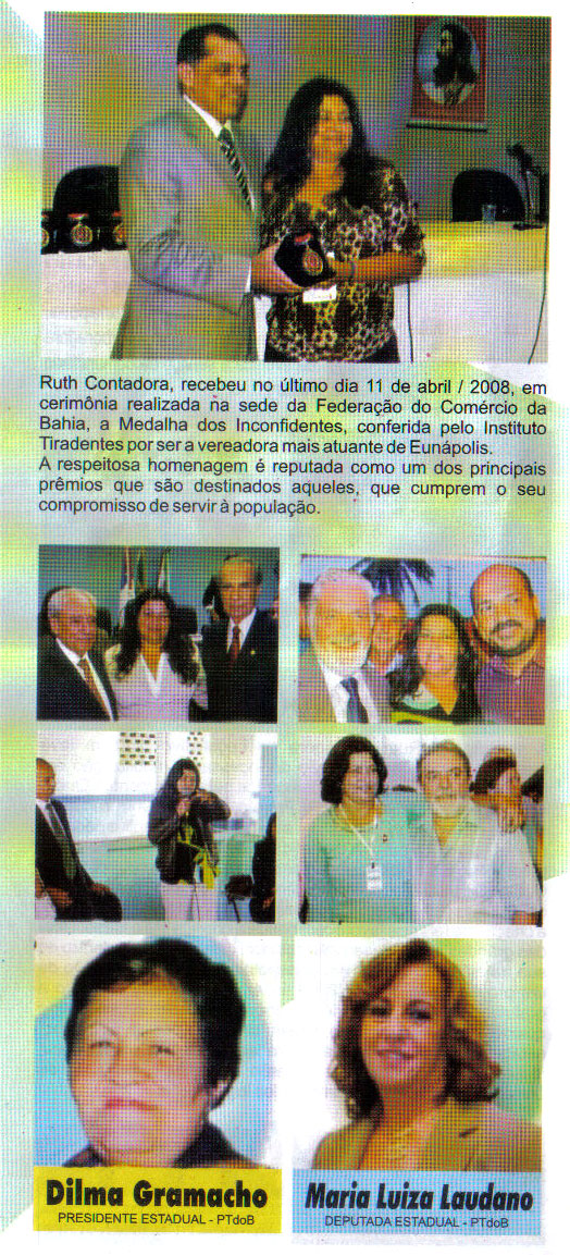 Outro reconhecimento do seu trabalho ocorreu no dia 11 de abril deste ano, quando, em cerimônia realizada na sede da Federação do Comércio da Bahia, a vereadora recebeu das mãos do prefeito de Salvador, João Henrique, a Medalha dos Inconfidentes, premiação que lhe foi concedida pelo Instituto Tiradentes, por ter sido escolhida como a mais atuante vereadora de Eunápolis.
