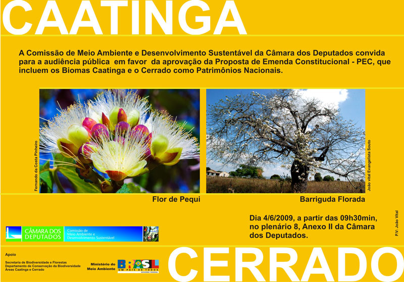 Uma Audiência Pública marcada para o dia 4 de junho, na Câmara dos Deputados, vai defender a aprovação da Proposta de Emenda Constitucional (PEC) nº 115, que inclui a Caatinga e o Cerrado entre os patrimônios nacionais. A aprovação da PEC é um poderoso instrumento para os dois biomas, que terão visibilidade nacional e internacional, além de um ambiente político favorável à conservação e uso sustentável de recursos naturais fundamentais para a economia e a qualidade de vida de suas populações. A PEC 115 foi apresentada em 1995 ao Congresso Nacional. Ela altera o artigo 225, § 4º da Constituição Federal, que já trata como patrimônios nacionais a Floresta Amazônica, a Mata Atlântica, Serra do Mar, Pantanal Mato-Grossense e Zona Costeira.
