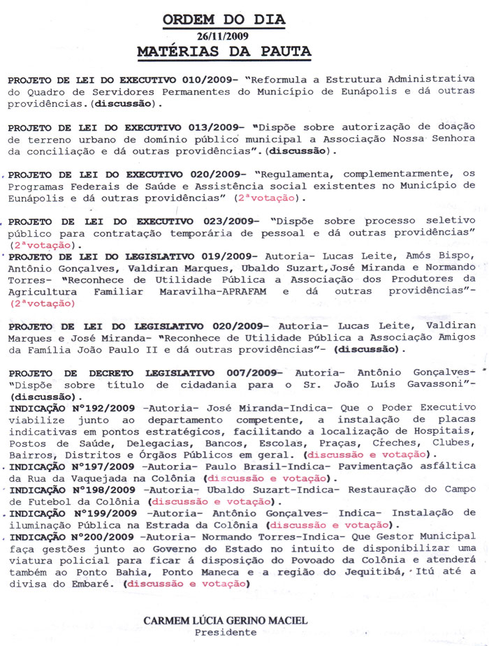 Terminados os discursos, foi iniciada a votação dos projetos do Executivo e do Legislativo mais as indicações dos vereadores, tanto os projeto quanto as indicações, o que foi colocado em votação, todos foram aprovados por unanimidade.