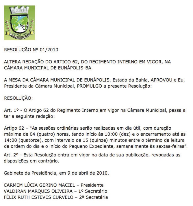 Aprovado na sessão de ontem da Câmara Municipal de Eunápolis, o Projeto de Resolução nº 01/2010, de autoria da Mesa Diretora, que alterou a redação do artigo 62 do Regimento Interno, o qual estabelece os dias e horários das sessões ordinárias da casa legislativa. A matéria foi aprovada por unanimidade.