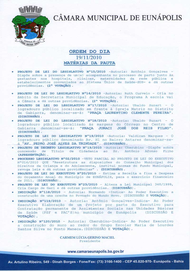 20/11/2010 - Pauta da Sessão Ordinária da Câmara Municipal de Eunápolis