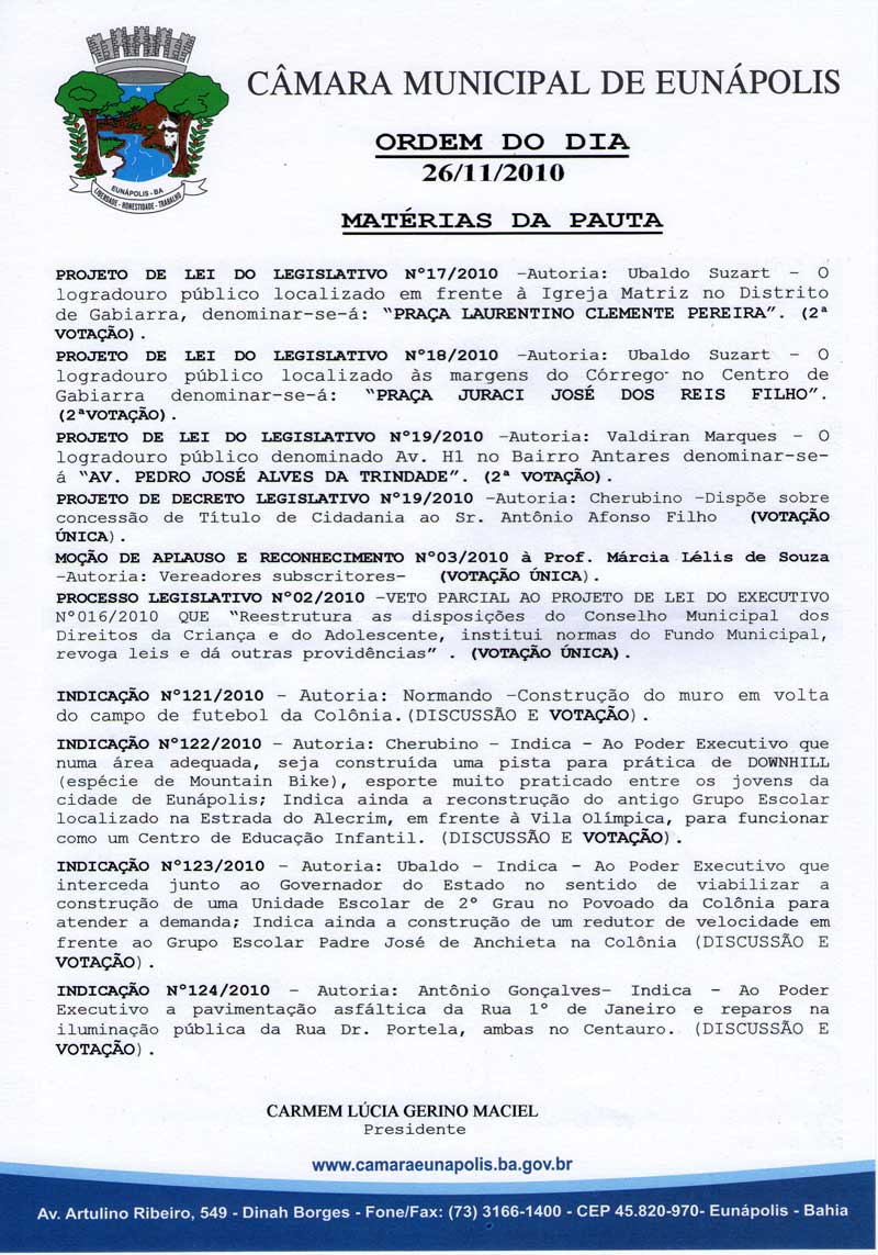 Matéria da Pauta da Sessão Distrital da Câmara Municipal de Eunápolis